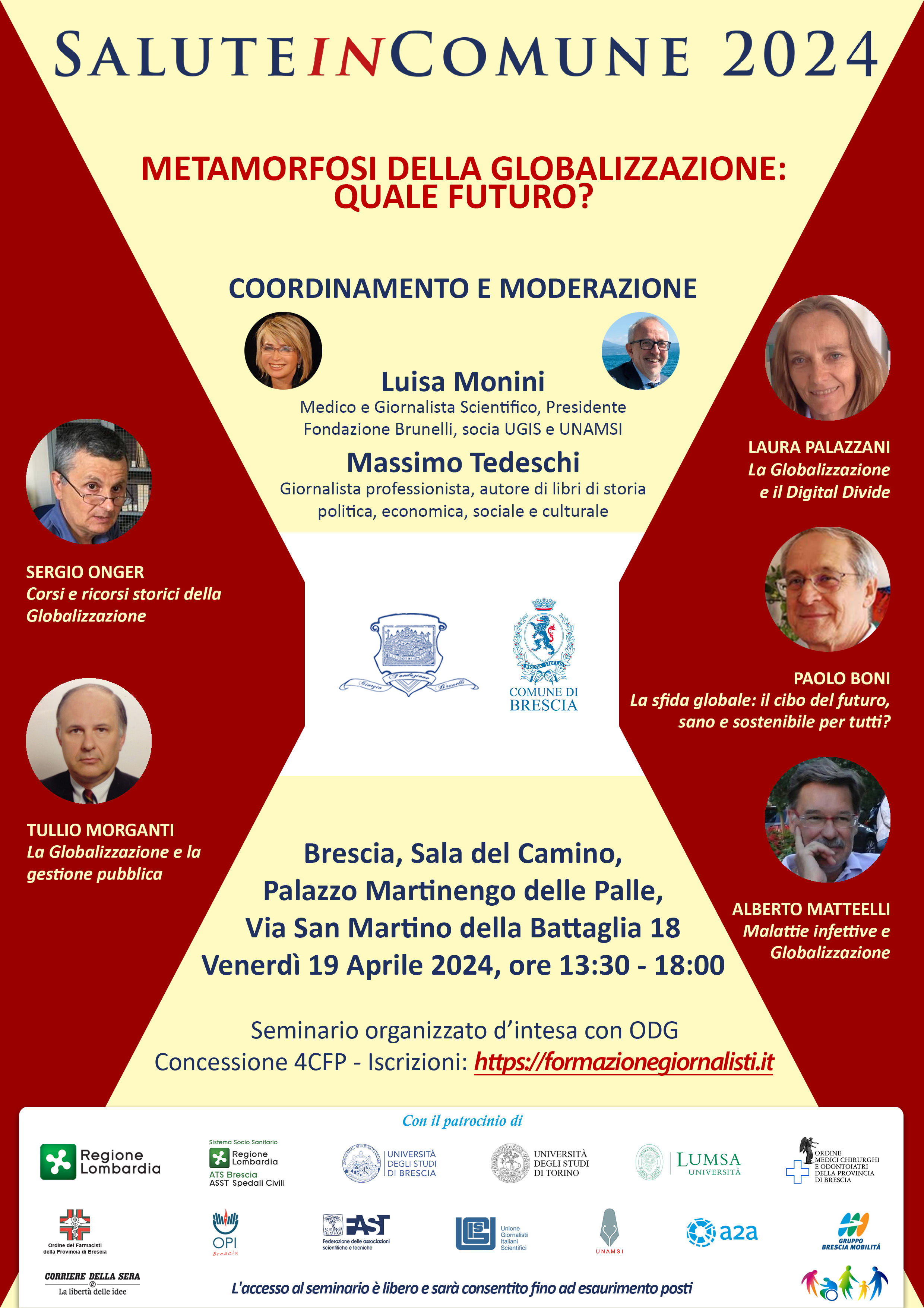 Venerdì 19 aprile 2024, alle ore 13:30, si terrà, presso la Sala del Camino di Palazzo Martinengo delle Palle (via San Martino della Battaglia 18), l'evento "Metamorfosi della globalizzazione: quale futuro?" del ciclo di appuntamenti relativi al Seminario "Salute in Comune".